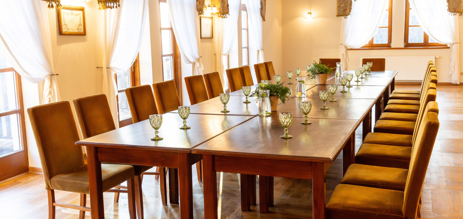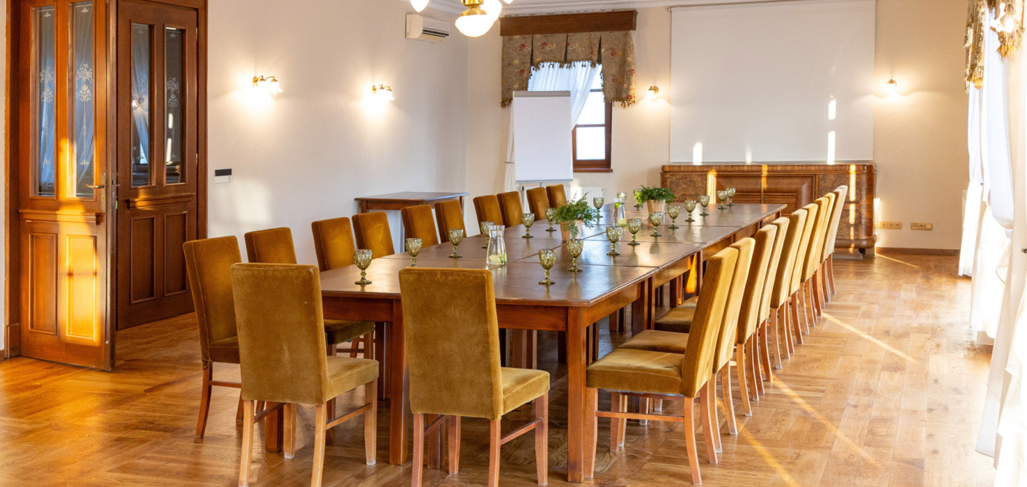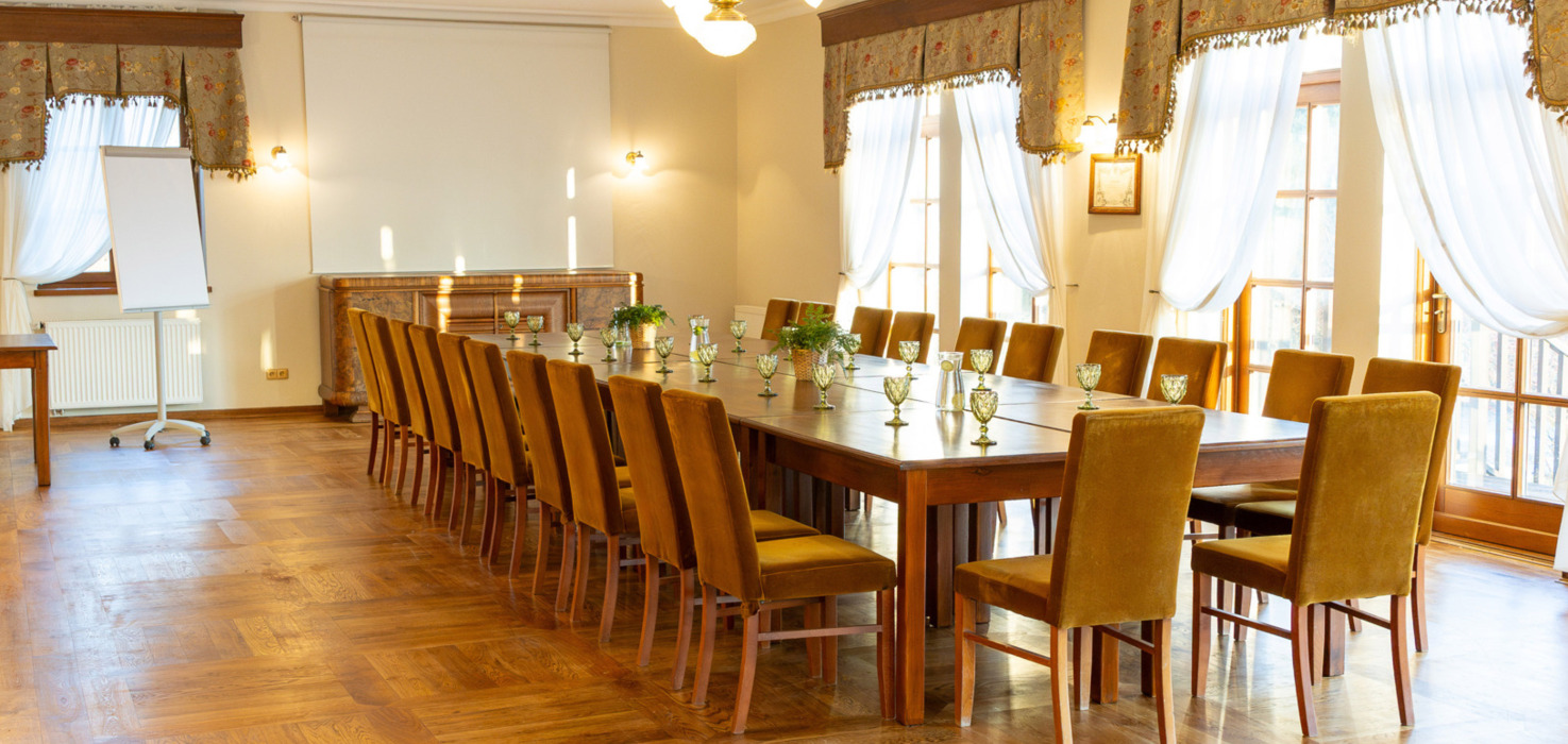 - Salę konferencyjną przestronną z wyjściem na taras. Sala z wyposażeniem Projektor, Flipchart, Mazaki-