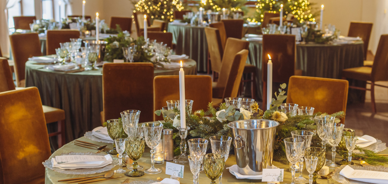 - Kompleksowa dekoracja zimowa – świece, lampiony, girlandy, tekstylia, żywe rośliny, choinki i bajkowa sceneria